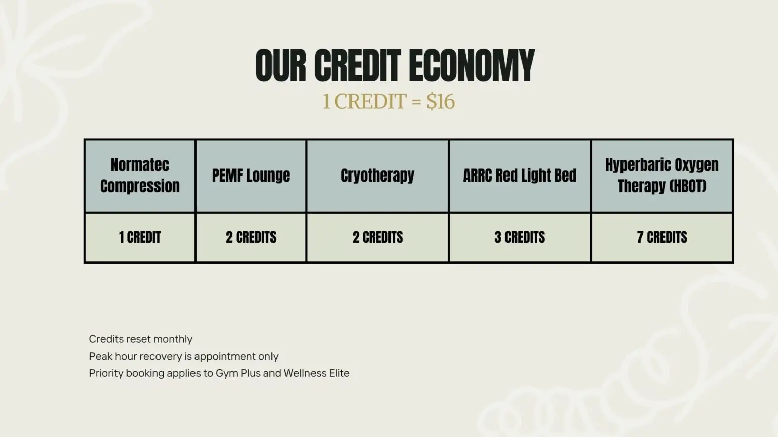 • 16 Credits monthly for any Wellness & Recovery treatments Use toward any therapies